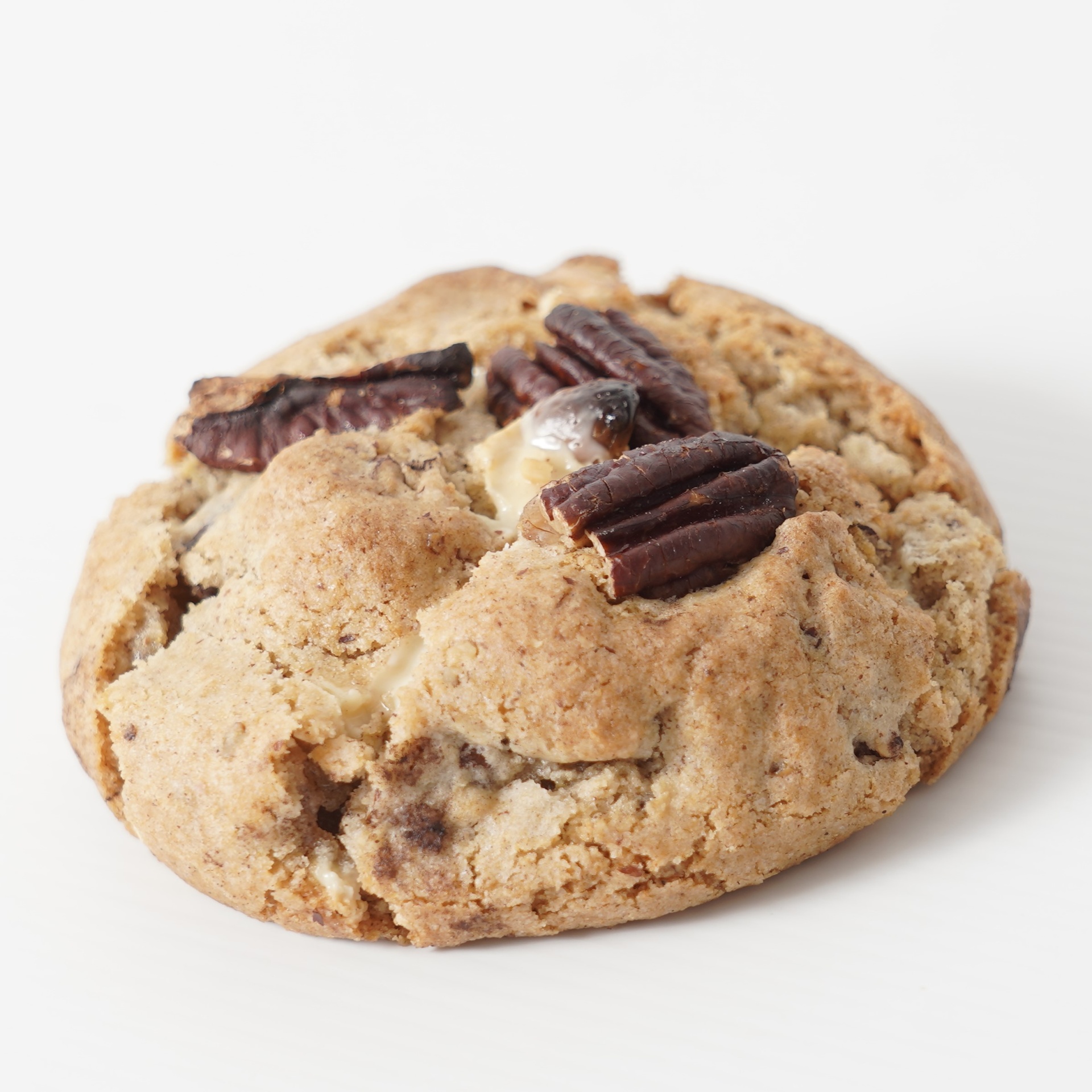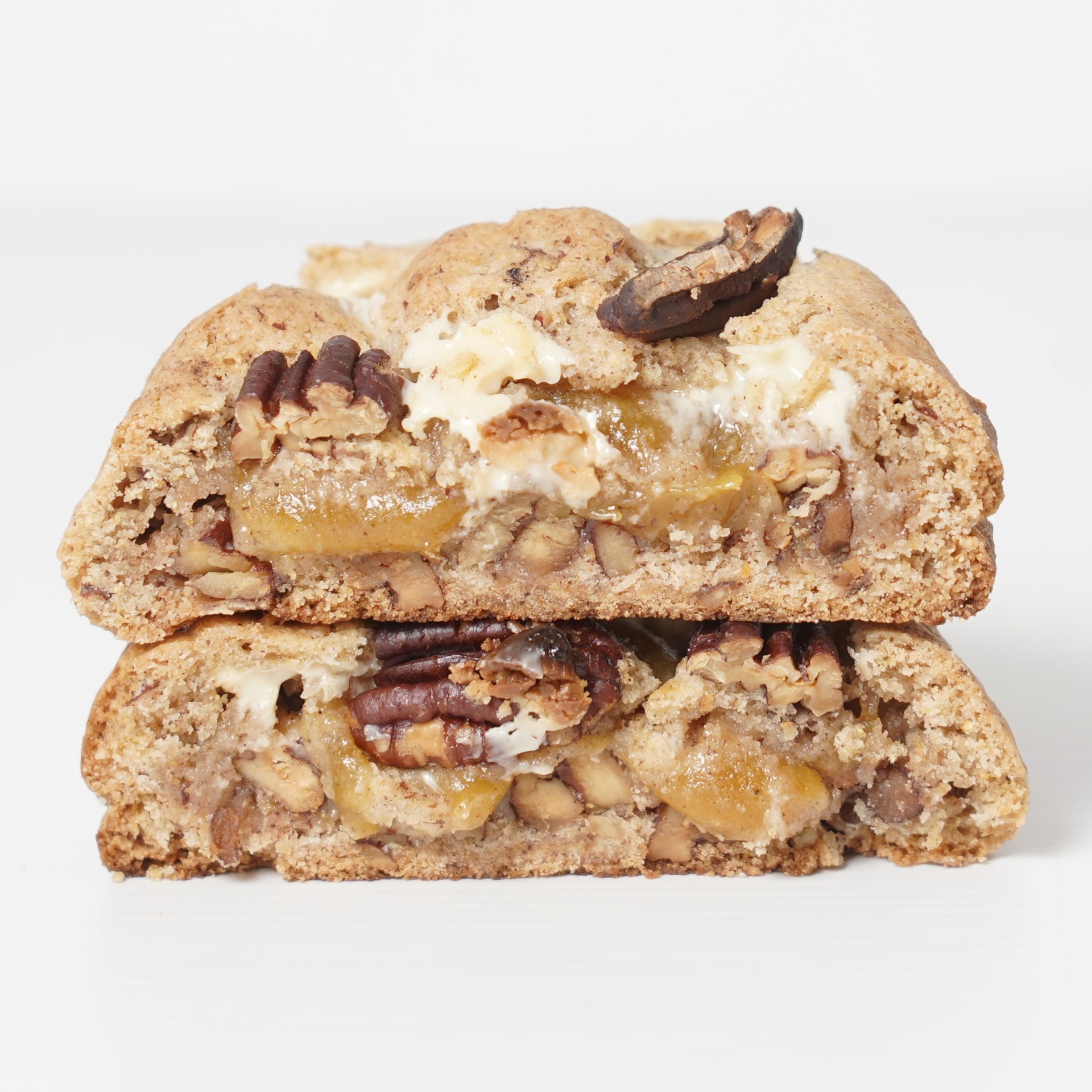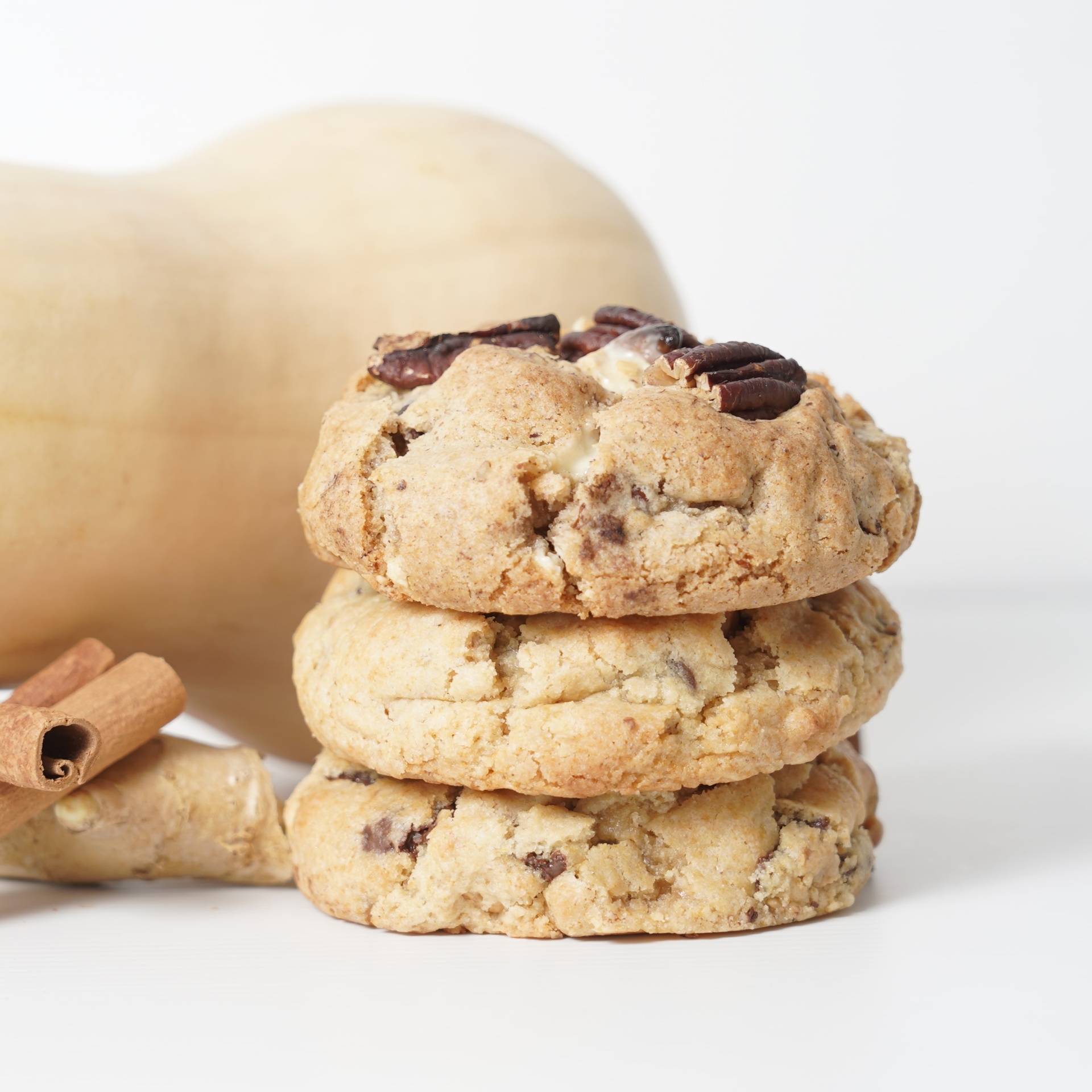Onde o conforto encontra a intensidade. Uma massa densa e perfumada com um blend de especiarias, carregada de chunks de chocolate branco vegan e a crocância das nozes pecan. No centro, o segredo: um recheio cremoso de brigadeiro de abóbora que eleva esta cookie a um nível de assinatura. Ridiculamente rica, é a prova de que a inclusividade não aceita compromissos no sabor.